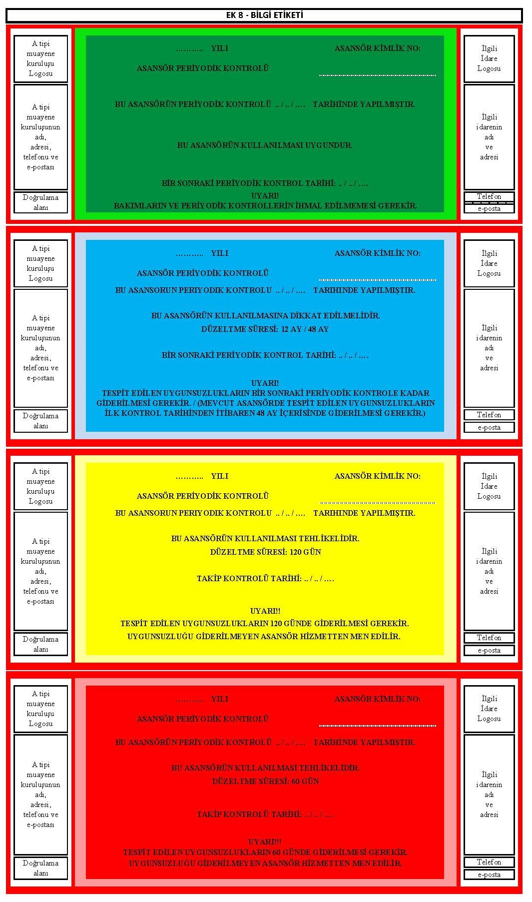 Kabin içinde görünür bir noktada olması zorunludur. Etikette kontrol tarihi, firma bilgileri ve rapor numarası bulunur.